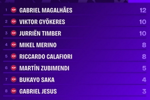 阿森纳本赛季英超头球攻门榜:加布里埃尔12次最多,马杜埃凯2次