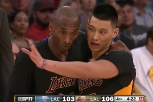 GIF-名场面—2014年11月湖人对快船,林书豪叫科比过来帮忙挡拆,面对保罗投进高难度三分